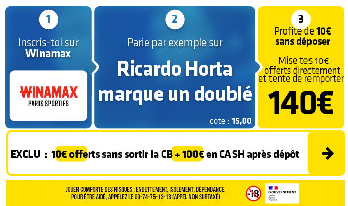 ► 2- Misez par exemple sur le pari "Ricardo Horta buteur" (cote à 3,10) chez Winamax :