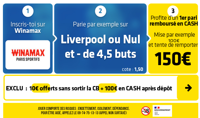 ► 3- Misez par exemple sur le pari "Liverpool ou Nul et - de 4,5 buts" (cote à 1,50) chez Winamax :