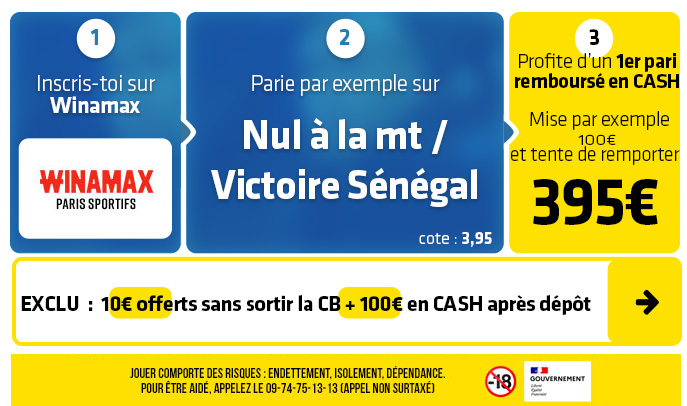 ► Le pari "Victoire Sénégal 2-1" est coté à 8,00 chez Winamax