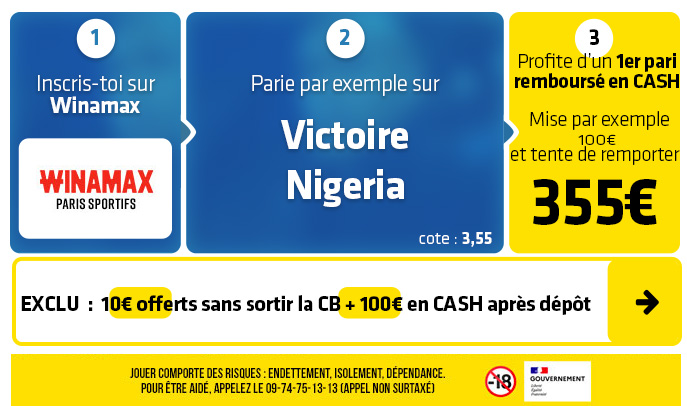 ► Le pari "Victoire Nigeria 2-1, 3-1 ou 4-1" est coté à 8,00 chez Winamax