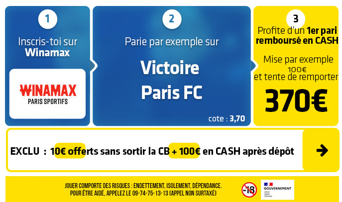 ► 1- Misez par exemple sur le pari "Victoire Paris FC ou match nul" (cote à 1,74) chez Winamax :
