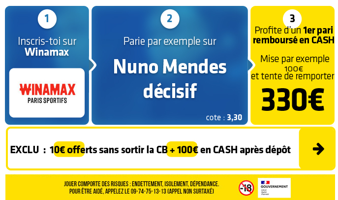► 2- Misez par exemple sur le pari "Nuno Mendes décisif (passeur ou buteur)" (cote à 3,30) chez Winamax :