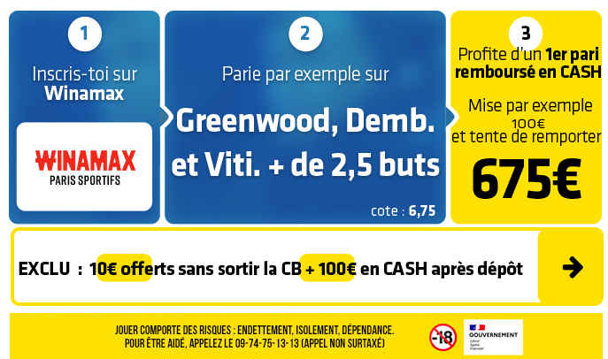 Dembélé + Greenwood + Vitinha marque + de 2,5 buts : Pour ce pari, il faut que 3 buts soient marqués à 3. C'est à dire que même juste Dembelé peut mettre un doublé et Greenwood un but (ou inversement) et ça passe ! On parle quand même ici du Ballon d'Or, du meilleur buteur de L1 avec 13 buts, mais aussi d'un Vitinha déjà auteur de 6 buts toutes compétitions confondues cette saison.