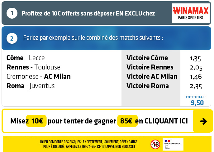 ► Le pari "Victoire Côme + Victoire Rennes + Victoire AC Milan + Victoire Roma" est coté à 9,50 chez Winamax