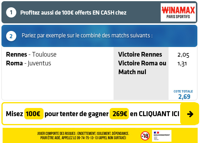 ► 1- Misez par exemple sur le pari "Victoire Rennes + Victoire Roma ou Match nul" (cote à 2,69) chez Winamax :