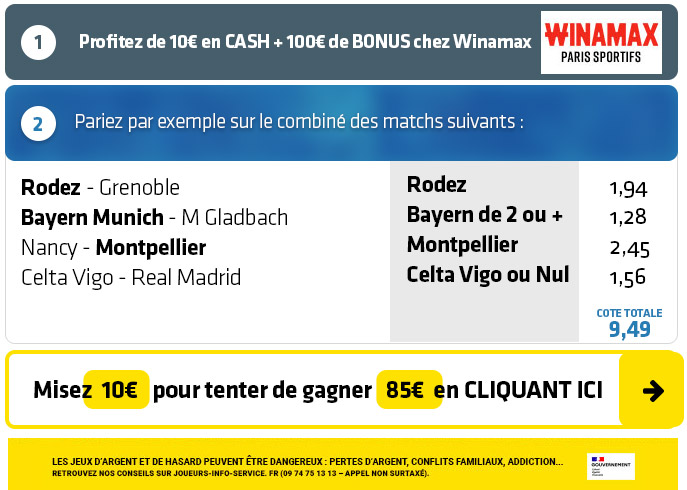 ► Le pari "Victoire Rodez + Le Bayern gagne de 2 buts ou + Victoire Montpellier + Victoire Celta Vigo ou match nul" est coté à 9,49 chez Winamax