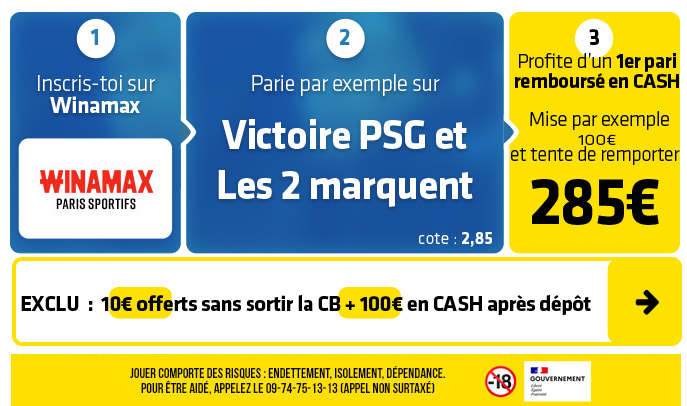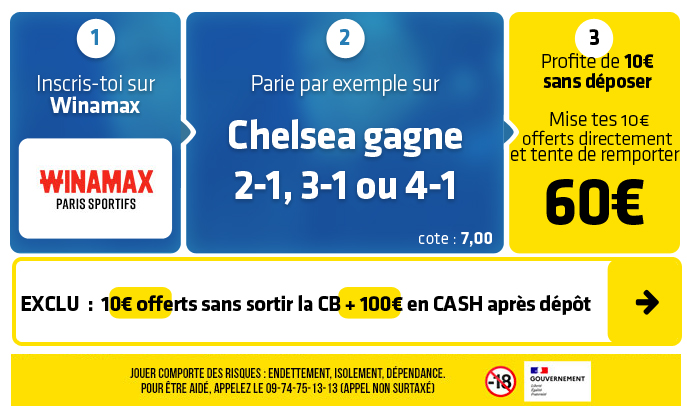 Avec le retour de blessures ces derniers jours du Ballon d'Or Dembélé et du milieu indispensable Neves, le champion d'Europe en titre parisien est logiquement favori à domicile. Mais la grosse cote de la victoire de Chelsea peut clairement se tenter au vu des absences parisiennes sur certains matchs (Monaco en a profité vendredi en L1 en s'imposant au Parc 1-3). Et d'autant plus avec les 10€ à récupérer sans déposer chez Winamax qui vous offrent un pari sans pression.