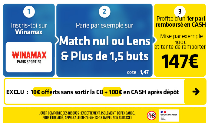 ► 1- Misez par exemple sur le pari "Match nul ou Victoire Lens & Plus de 1,5 buts" (cote à 1,47) chez Winamax :