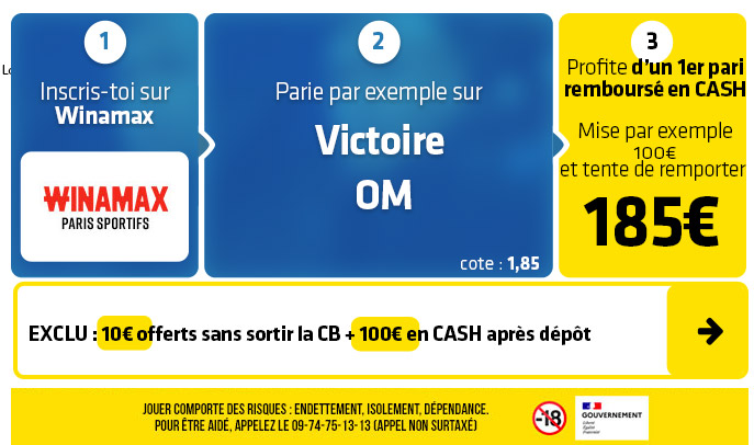 ► 1- Misez par exemple sur le pari "Victoire OM" (cote à 1,85) chez Winamax :