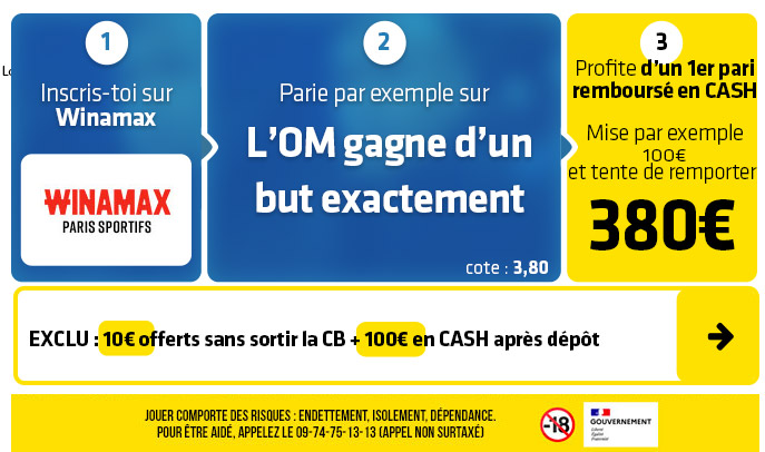 ► 2- Misez par exemple sur le pari "L'OM gagne d'un but exactement" (cote à 3,80) chez Winamax :