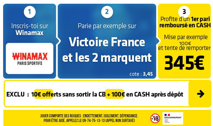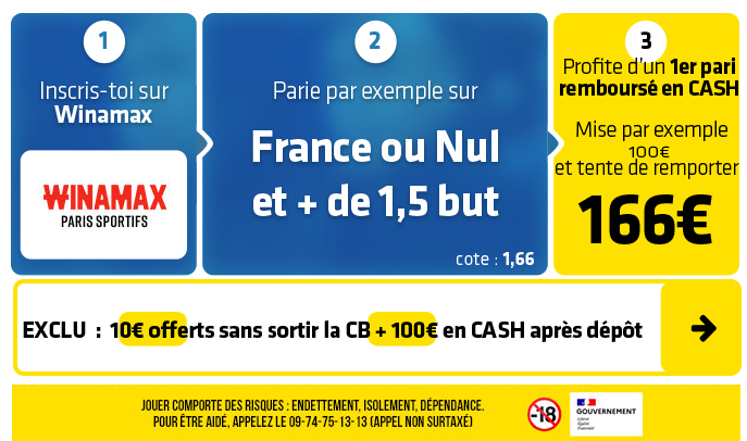 ► 1- Misez par exemple sur le pari "Victoire France ou match nul et + de 1,5 but" (cote à 1,66) chez Winamax :