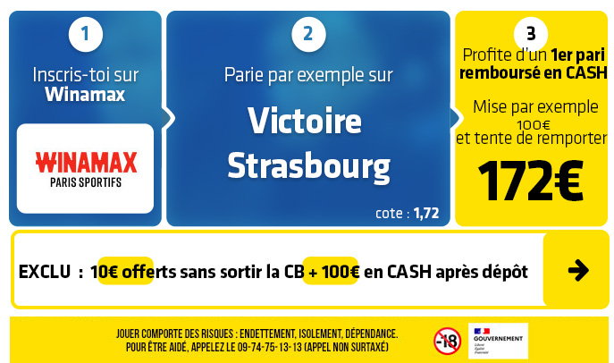 ► 1- Misez par exemple sur le pari "Victoire Strasbourg" (cote à 1,72) chez Winamax :