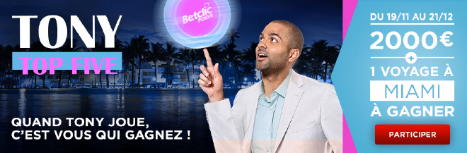 Du 19 novembre au 21 décembre, jouez et remportez sur Betclic Poker un voyage pour 2 personnes à Miami pour aller voir un match entre les Spurs de San Antonio (l'équipe de Tony Parker) et le Heat de Miami, mais aussi du cash et des tickets poker. C'est le "Tony Top 5" !