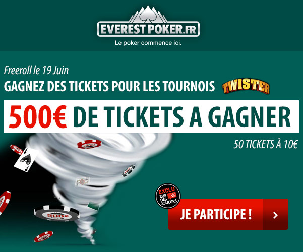 10 000€ ça vous tente ? RueDesJoueurs et Everest Poker vous donne de la possibilité de gagner des tickets gratuitement pour participer aux tournois Twister et peut-être remporter 10 000€.